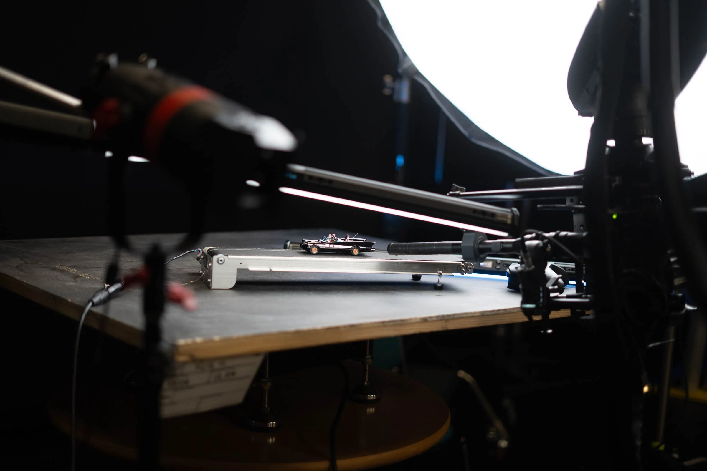 We combined virtual production, motion control, and a custom miniature stage to blend physical realism with digital flexibility.